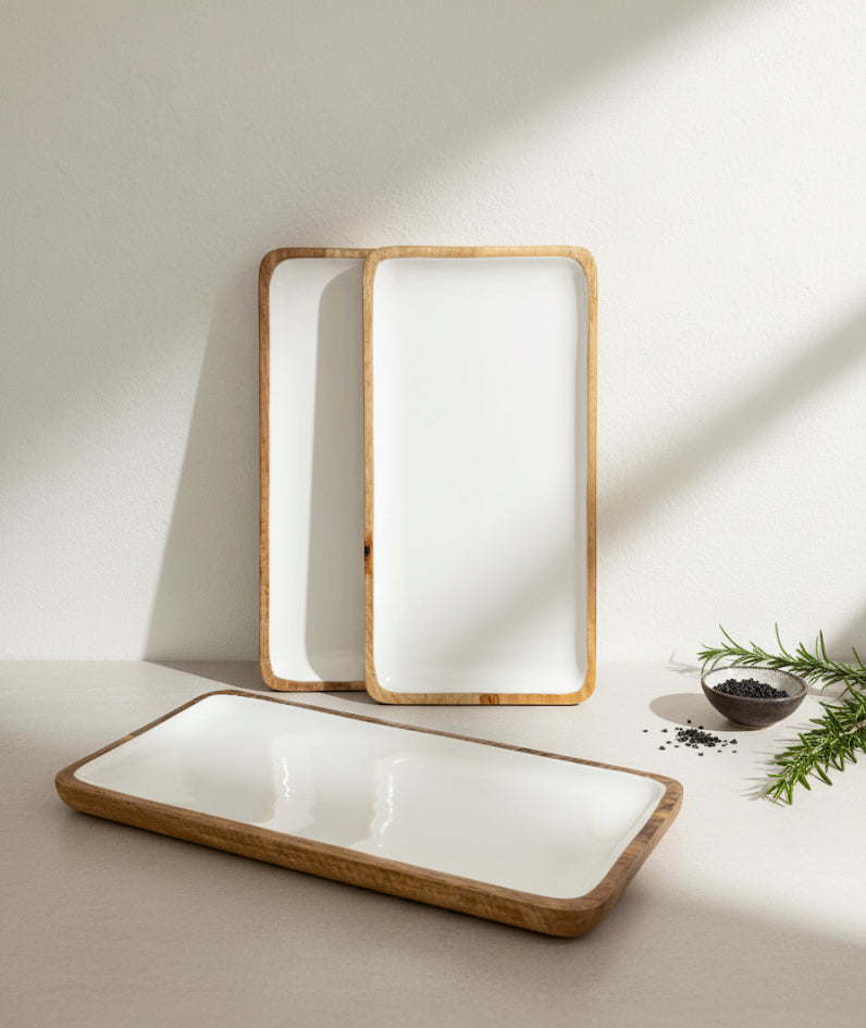 Bandeja rectangular en madera de mango y esmaltada en color blanco para usar como decoración de mesa. Apta para alimentos, pero no para líquidos calientes.