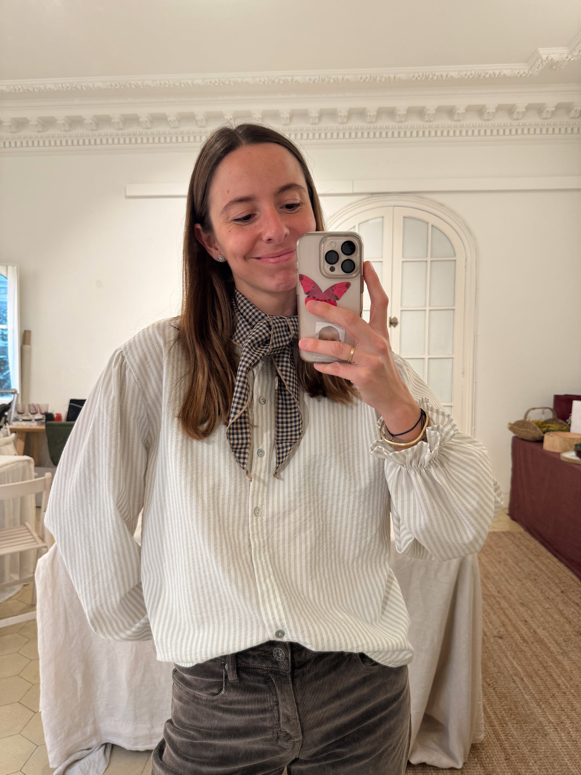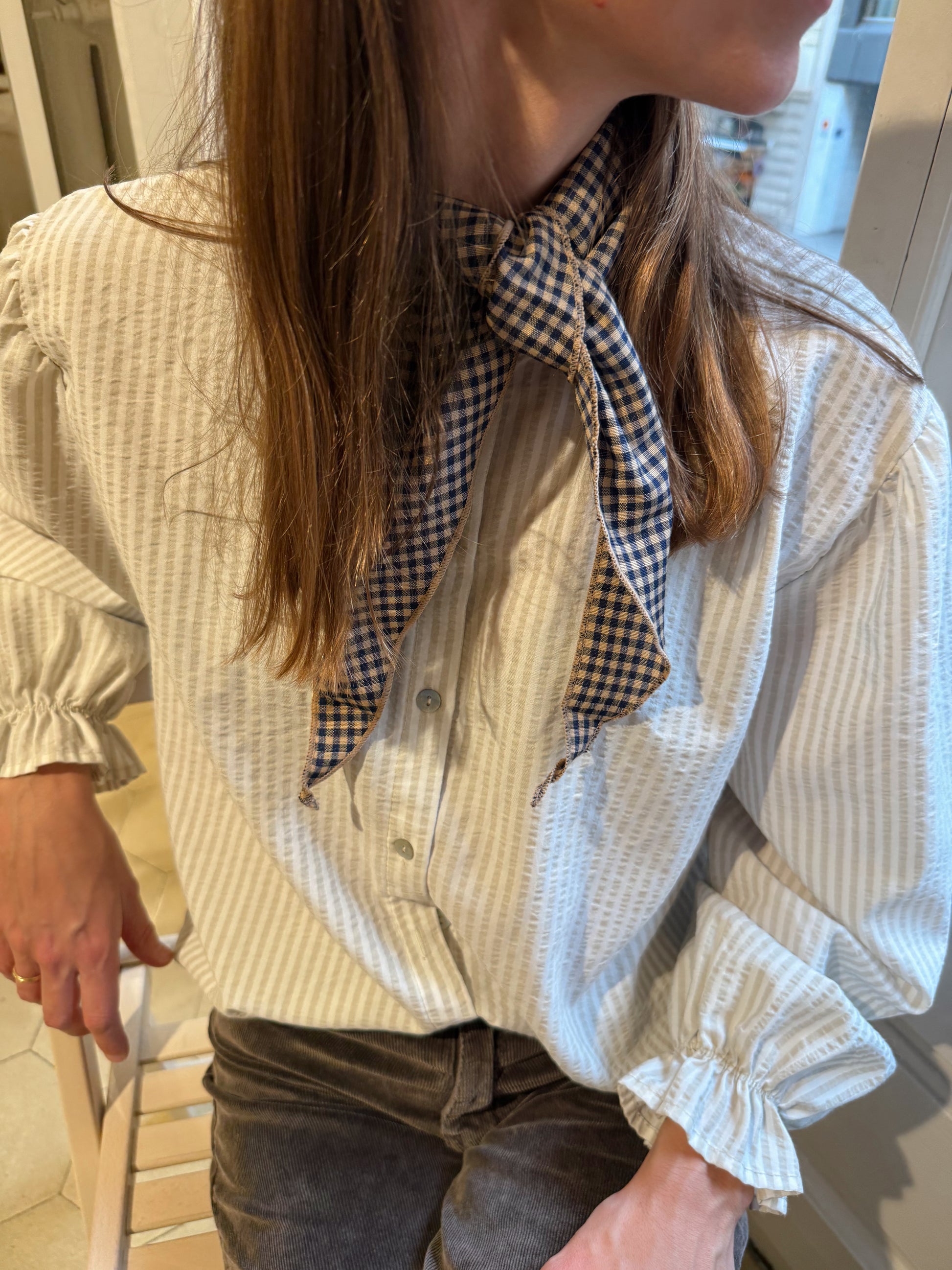 Blusa de rayas coral o beige, cuello delicadamente fruncido y puños con volante. Una blusa romántica y fácil de llevar.