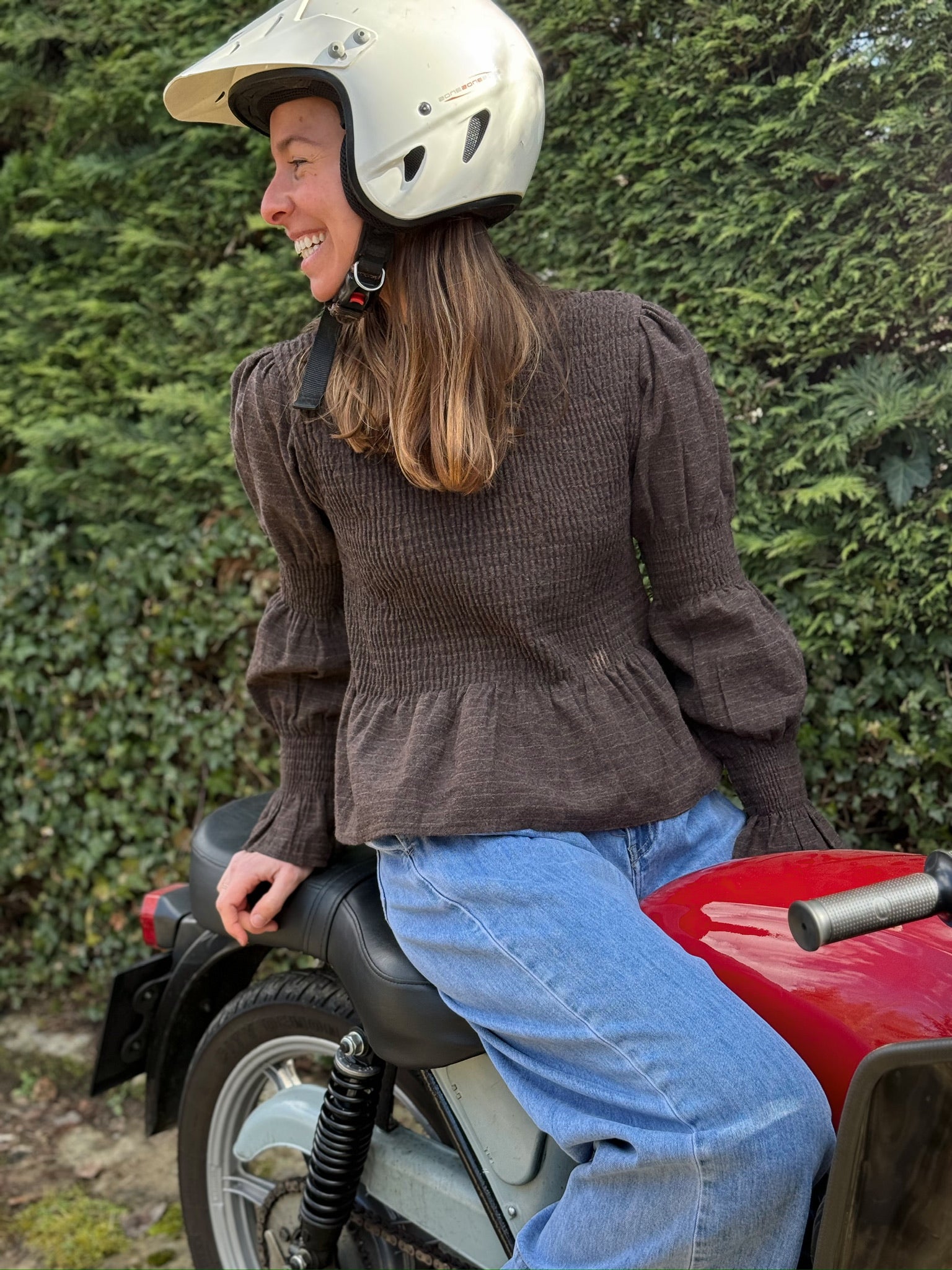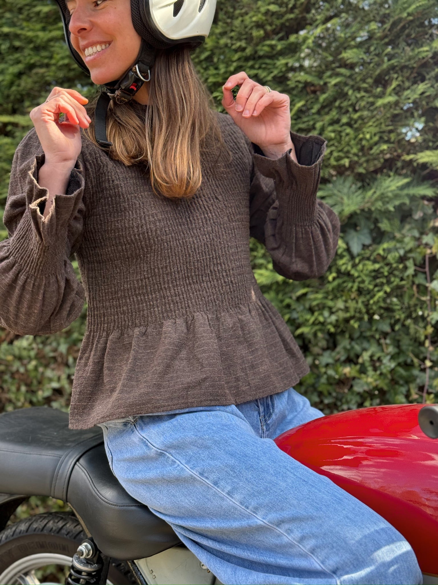 Blusa franela marrón con rayitas. Nido de abeja. Talla única.