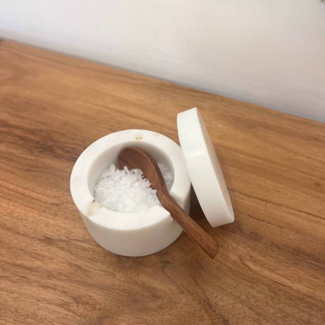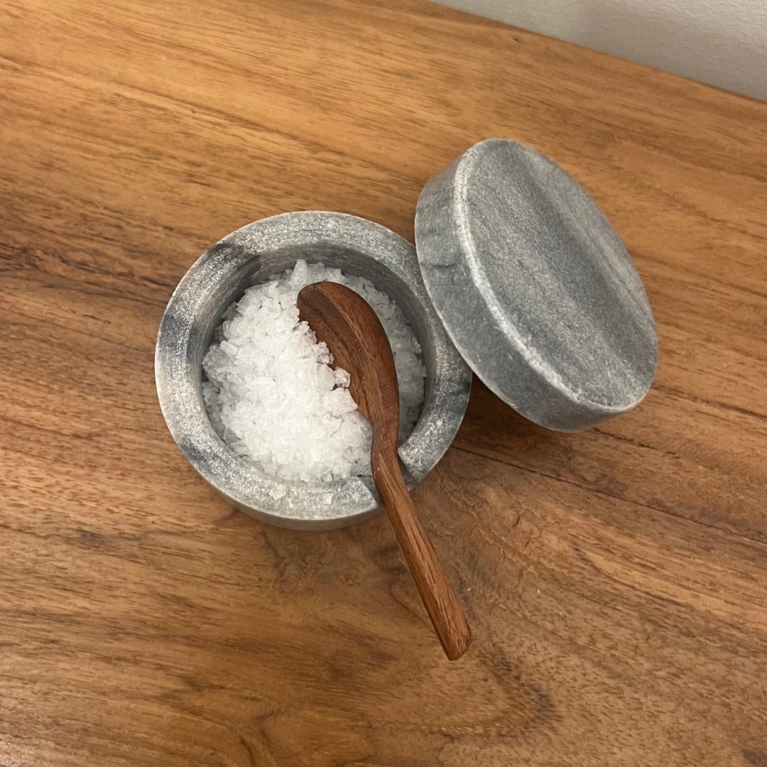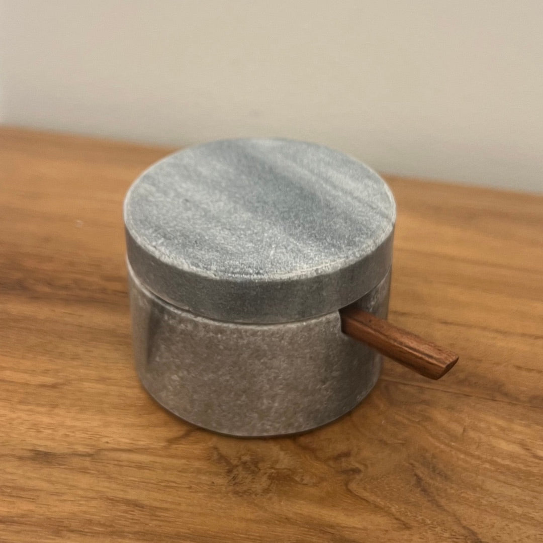 Recipiente pequeño de mármol, disponible en gris o en blanco, con cucharita de madera para condimentos.